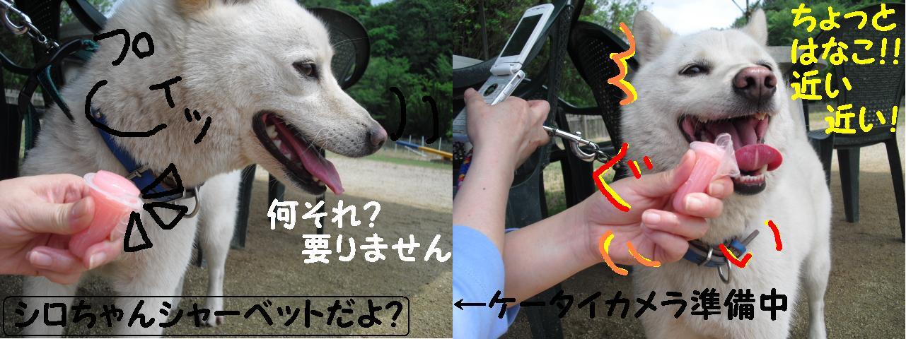 シロちゃん初めてのわんこ用シャーベットに戸惑い気味