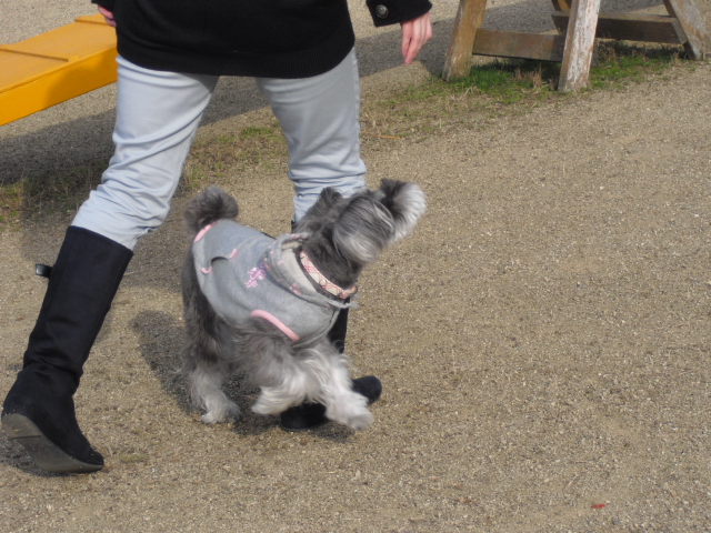 歩くお母さんの足の間をスルスルくぐるナナちゃん
