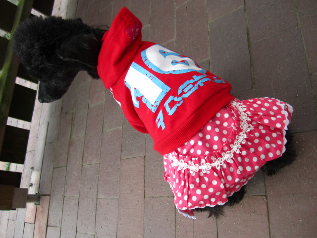 色々引っ張り出してきて、唯一の赤い服でやっと女の子らしくなりました