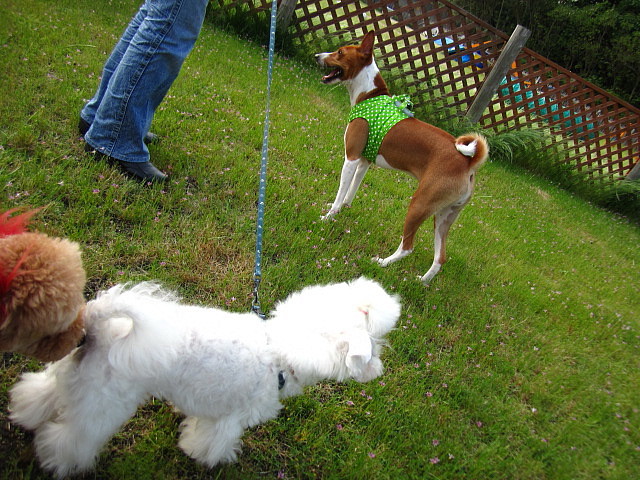 ルーちゃんにリードを持って引っ張られて「え?」って顔のりきは